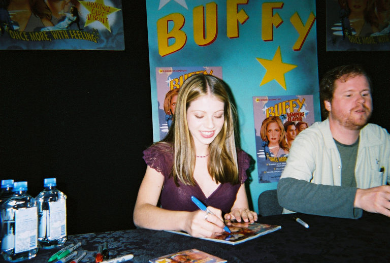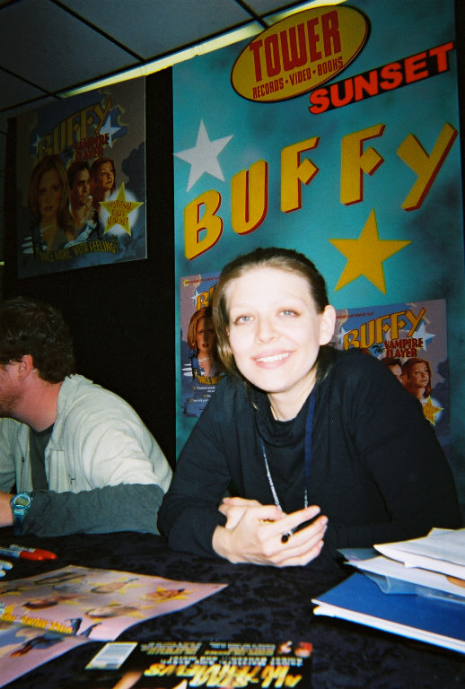 So anyway, I got up to Michelle T. She looked really nice! I couldn't think of anything to say to her but Joy was talking to her after I got her autograph and Joy was saying how she could actually talk and Michelle was like "and the breathing, that's good" and stuff. It was cute. So then I got to Joss and the CD book was still open to the page with Michelle's pic and he asked if there was any particular place I wanted him to sign and I was like "No, anywhere is fine," and he joked about signing over the pic of Michelle but then signed it underneath and said something about since he took the picture, he should get artist credit or something like that. I think I said "oh, that's cool that you took the picture." It's funny but a year ago I would have been so psyched to see him and now it's like "Joss sucks."